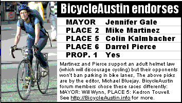 City Council Endorsementsfor the May 2006 election We would never suggest that citizens base their decisions on who to vote for on just one issue, like transportation. But we do believe that citizens should consider a candidate's position on specific issues in forming their overall picture of the candidate. It is in that spirit that we offer the following endorsements. Your editor and the forum members disagreed in two races about whom we should endorse, so below we offer two sets of endorsements. Take your pick. Word on the street is that former Mayor Bruce Todd is lobbying for a return of the adult helmet law. While nobody is opposed to helmets, the problem with a helmet law is that people will choose to drive rather than bike with a helmet. A helmet law would thus be the death blow to our efforts to get people to commute by bike. Argue all you want about that people shouldn't avoid biking just because they have to wear a helmet, but that's the reality -- and the experience of every community all over the world which implemented a similar law. There is no better way for the City to discourage cycling and encourage more driving than passing an adult helmet law, short of giving away free gasoline. We surveyed Council candidates on a variety of bicycling and transportation questions. All of them returned the survey except Mark Hopkins and Brewster McCracken in Place 5. You can see our survey and the candidates’ answers for more background. By Michael Bluejay (BicycleAustin editor) Mayor Jennifer Gale Place 2 Mike Martinez Place 5 Colin Kalmbacher Place 6 Darrell Pierce Prop. 1 (Open Govt.) Yes Mayor: Jennifer Gale Okay, Jennifer Gale is admittedly a little crazy. But I'll take a little crazy over bad public policy any day. Mayor Will Wynn and Danny Thomas are "normal", and that normalcy means they won't get cars out of bike lanes or promise not to vote for a helmet law. (We're guessing about Thomas' position on the latter, since he didn't answer that question in our survey.) And yes, the Mayor said that he's only "leaning" towards supporting a helmet law and that he'd have to be convinced that it's a good idea before he'd definitely support it, but that's not nearly as good as Gale's flat-out opposition to it. Gale also supports increasing staffing for the City's Bicycle Program, while Wynn won't commit to that. If I'm selecting based on candidates’ positions, which seems like a reasonable way to do it, then Gale is unquestionably friendlier to our interests. Many BicycleAustin forum members pleaded with me to not endorse Gale because they said it would make the biking community look bad, and that no one would seek our endorsement again. I don't think so, because I've chosen Jennifer Gale as BicycleAustin's endorsement twice before, once for mayor, and once as recently as last year, and almost all the candidates are still seeking BicycleAustin's endorsement. The mayor's campaign called seeking an endorsement before we even began our process, and nearly all the candidates returned the survey we sent out. Still, I told list members that I would highlight the list's endorsements in the Chronicle ad instead of my own if either 1/3 of the list members would fill out the online endorsement ballot, or list members would pitch in to pay the $432 for the Chronicle ad, which I had originally planned to pay for out of pocket. That is, if the ad were to represent the community, then I wanted to see some participation from the community, either by voting in reasonable numbers or funding the ad that is to represent their position. But only 19% voted in the polling, and only 15 out of the 212 members pledged anything to pay for the ad, which didn't amount to 3/4 of the amount needed. So I paid for the ad myself and highlighted my own endorsements, but also made it very clear in the ad how forum members picked two races differently, and their choices are represented too. Place 2: Mike Martinez Ugh. Every candidate in this race either wants parking in bike lanes or an adult helmet law. Since the forum members and I liked Mike Martinez except for his support of a helmet law, I called him up to ask if he were aware why we oppose it: That every community that has passed a similar law has seen a drastic reduction in the number of cyclists on the road. He said he wasn't aware of that, and that it gave him enough pause that he'd want to get more information before making a decision. That's a lot better than "I want a helmet law no matter what". Wes Benedict opposes a helmet law but he won't ban parking in bike lanes, and frankly, his hardcore Libertarianism is more than a little creepy. ("I don't support mandatory helmets for bike riders any more than I support mandatory condoms for gays.") Eliza May, who likes parking in bike lanes and an adult helmet law, is just right out. Place 5: Colin Kalmbacher I'd like to quote from the survey that Colin Kalmbacher returned: "As your City Councilmember I will strive and fight to see that not a single new road is constructed, not a road expanded or repaired without the addition of curbed bike lanes." Whoa. Pinch me, I must be dreaming. I would also be happy with Kedron Touvell who, like Kalmbacher, wants car-free bike lanes and no helmet law for adults, but Kalmbacher gets the edge for his gutsy survey answers. Place 6: Darrell Pierce As in Place 2, the choice here is between a candidate who wants an adult helmet law (Darrell Pierce) and those who want parking in bike lanes (Sheryl Cole, DeWayne Lofton). As with Place 2, I called our otherwise-favorite (Pierce) and he agreed that knowing that helmet laws tend to decrease cycling participation, he's inclined to slow down and want to get both sides before getting squarely behind a helmet law. So we like Pierce. Supporting a helmet law without knowing all the facts is a reasonable mistake, while supporting cars in bike lanes (like his opponents do) is just being out to lunch. Proposition 1: Open Government Transportatio